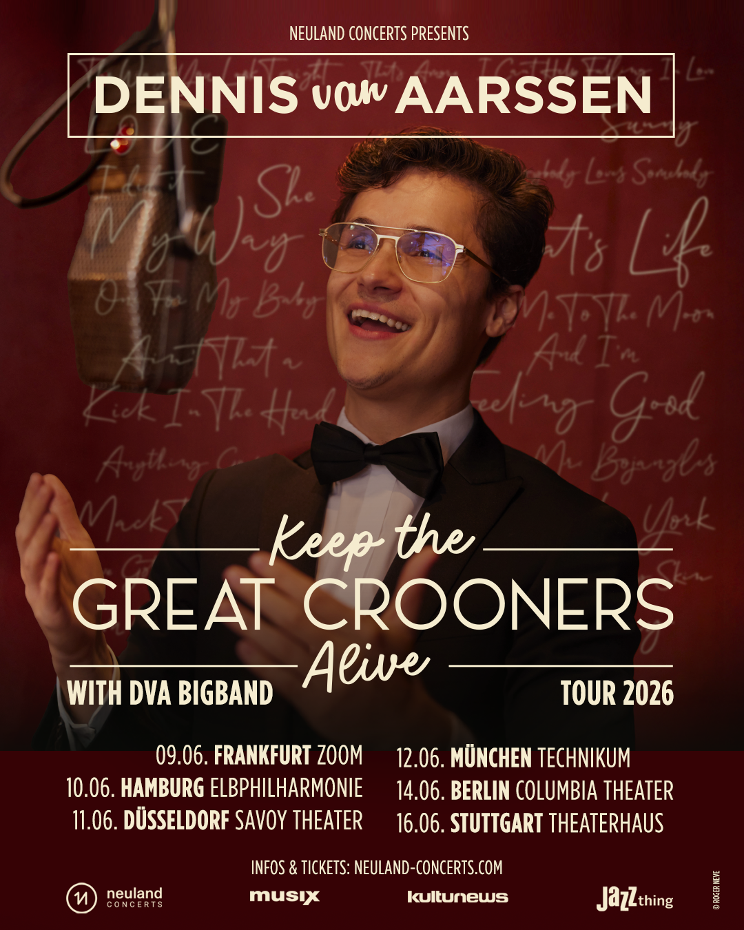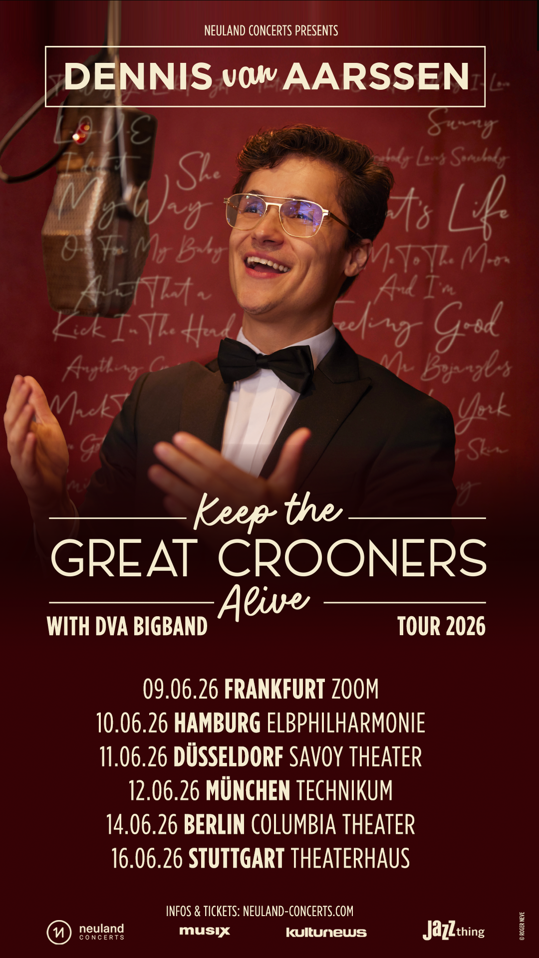 Das Dennis Van Aarssen ein toller Sänger ist, hört man sofort. Das er aber auch ein großartiger Entertainer ist, das hat er dieses Jahr mit seinen ausverkauften Shows in Hamburg und Köln bewiesen. Und nächstes Jahr gibt es dann den Jazz-Crooner-Pop- Nachschlag.